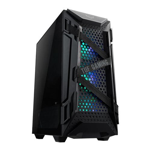ASUS TUF Gaming GT301 ATX mid-tower compact case with tempered glass side panel, honeycomb front panel, 120mm AURA Addressable RGB fan, headphone hanger and 360mm radiator support.